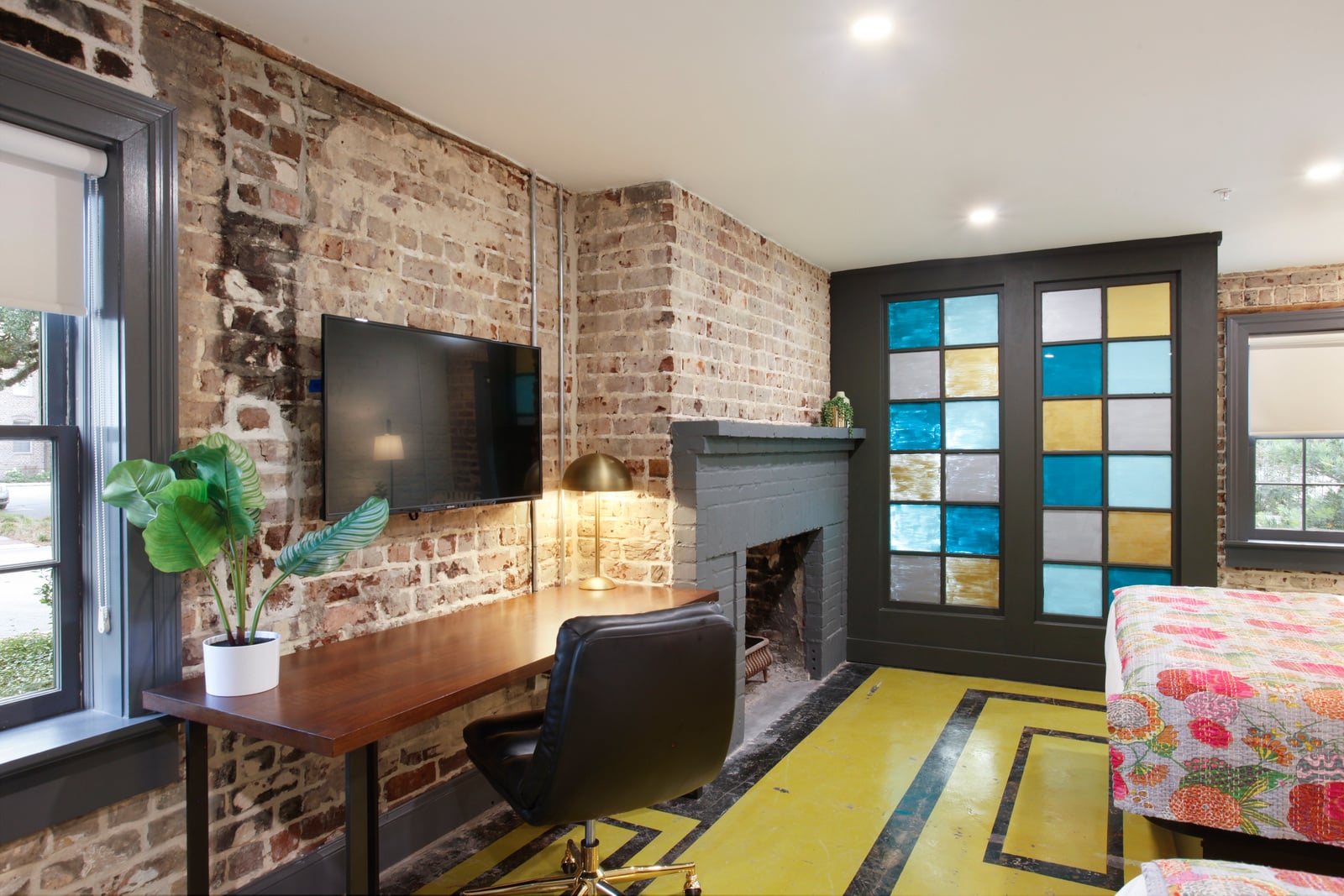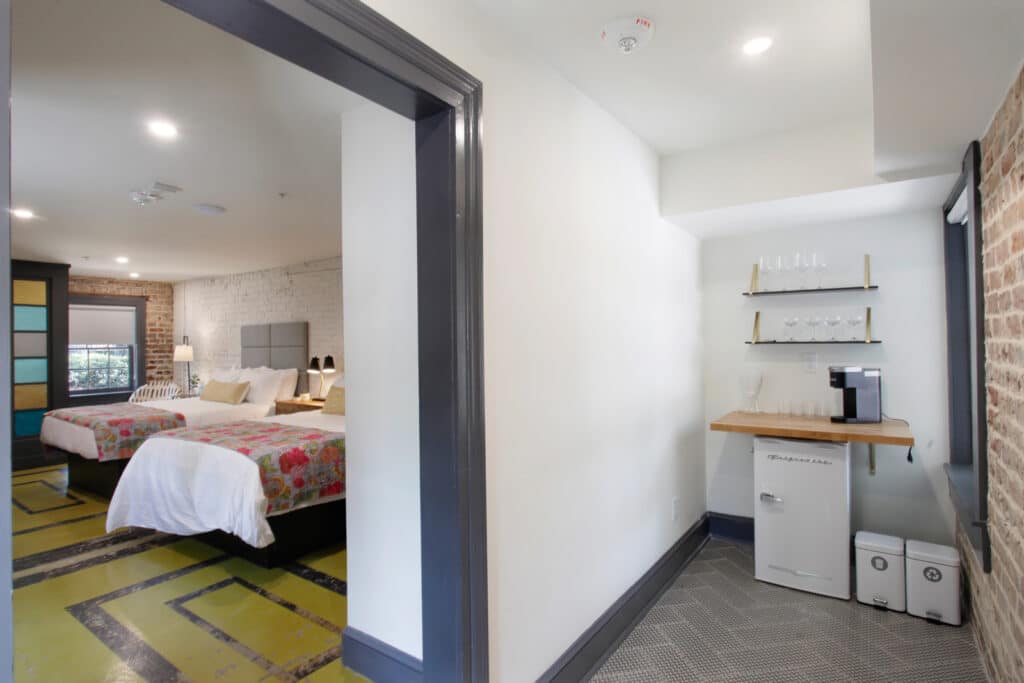 This charming ground-floor suite offers ultimate privacy with its own separate entrance directly from Houston Street. Inside, you’ll find two plush Queen beds, a cozy sitting area, and a spacious work desk. Unique interior design finishes enhance the suite’s appeal, making it a favorite among guests. Enjoy the convenience of easy, direct access from Houston Street for a seamless stay. The room is located in the main tower of the property, accessible via the main entrance off Houston St. or the courtyard off East McDonough St.