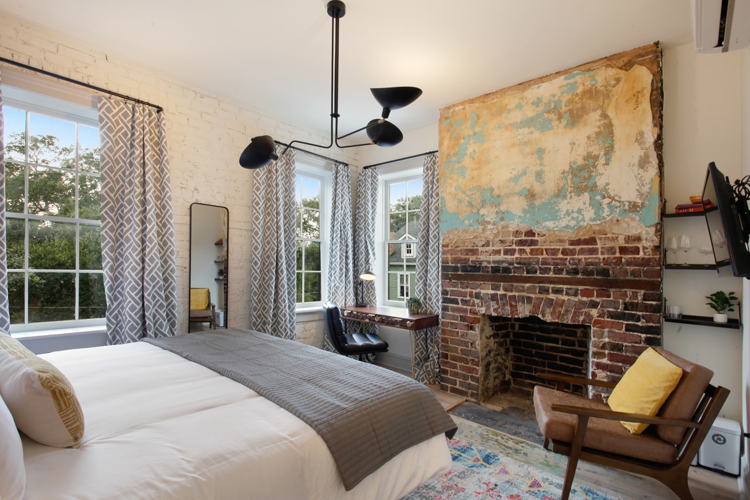 This suite was once the Art Studio of a historic mansion, blending timeless charm with modern comfort. It features a plush King bed and a work desk area with stunning views of beautiful Crawford Square. The Insta-worthy bathroom includes a gorgeous shower, while the original fireplace and unique interior design finishes add character and style. Located on the third floor, your private suite has its own entrance through common hallways and stairs, ensuring a peaceful and secluded escape. This is a third-floor unit accessible by two flights of stairs (please note, there are no elevators at the property).