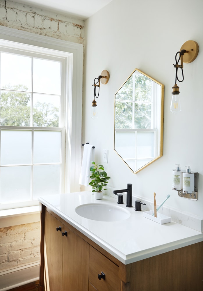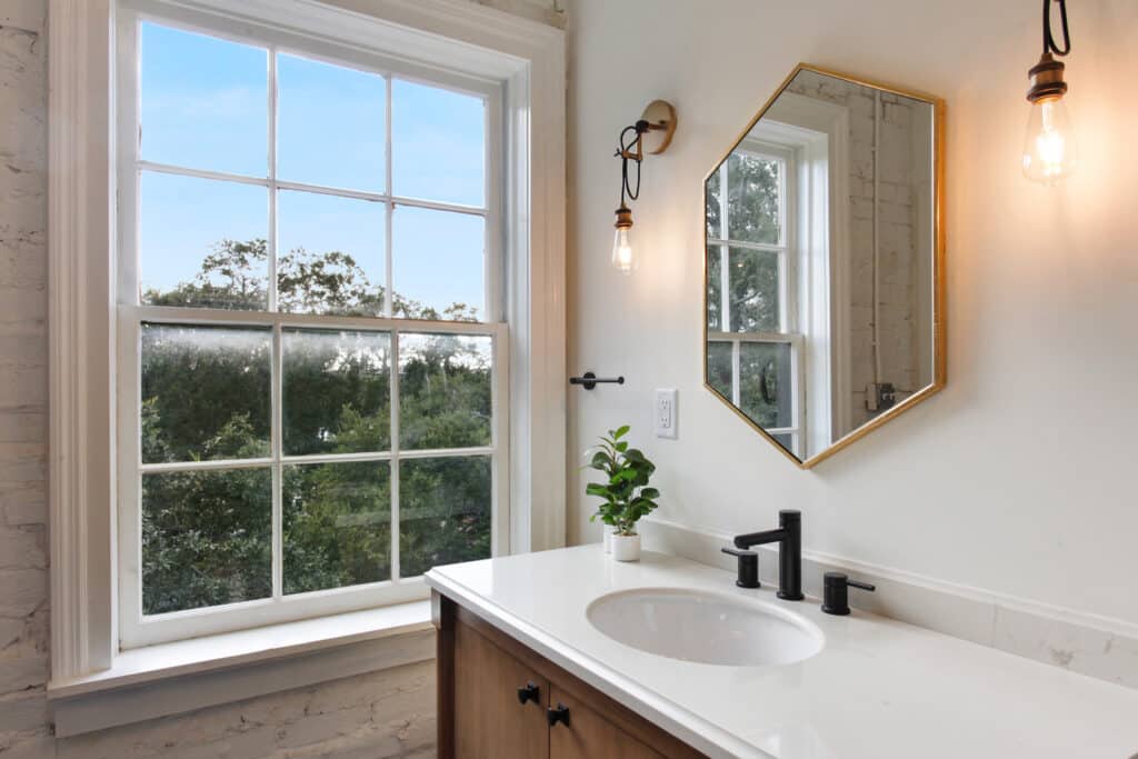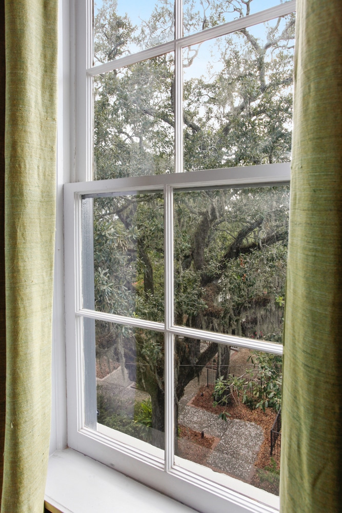 This spacious suite offers a plush Queen bed, a cozy sitting area, and a work desk with stunning treetop views of beautiful Crawford Square. The modern bathroom features a gorgeous double shower, perfect for relaxation. Original open beam ceilings and unique interior design touches further enhance the suite’s charm. Located on the fourth floor, your private suite has its own entrance through common hallways and stairs, providing a peaceful and secluded retreat. This is a fourth-floor unit that is accessible via 3 flights of stairs, as there are no elevators at the property. The room is in the main tower of the property and accessible via the main entrance off Houston St. or Courtyard off East McDonough St.
