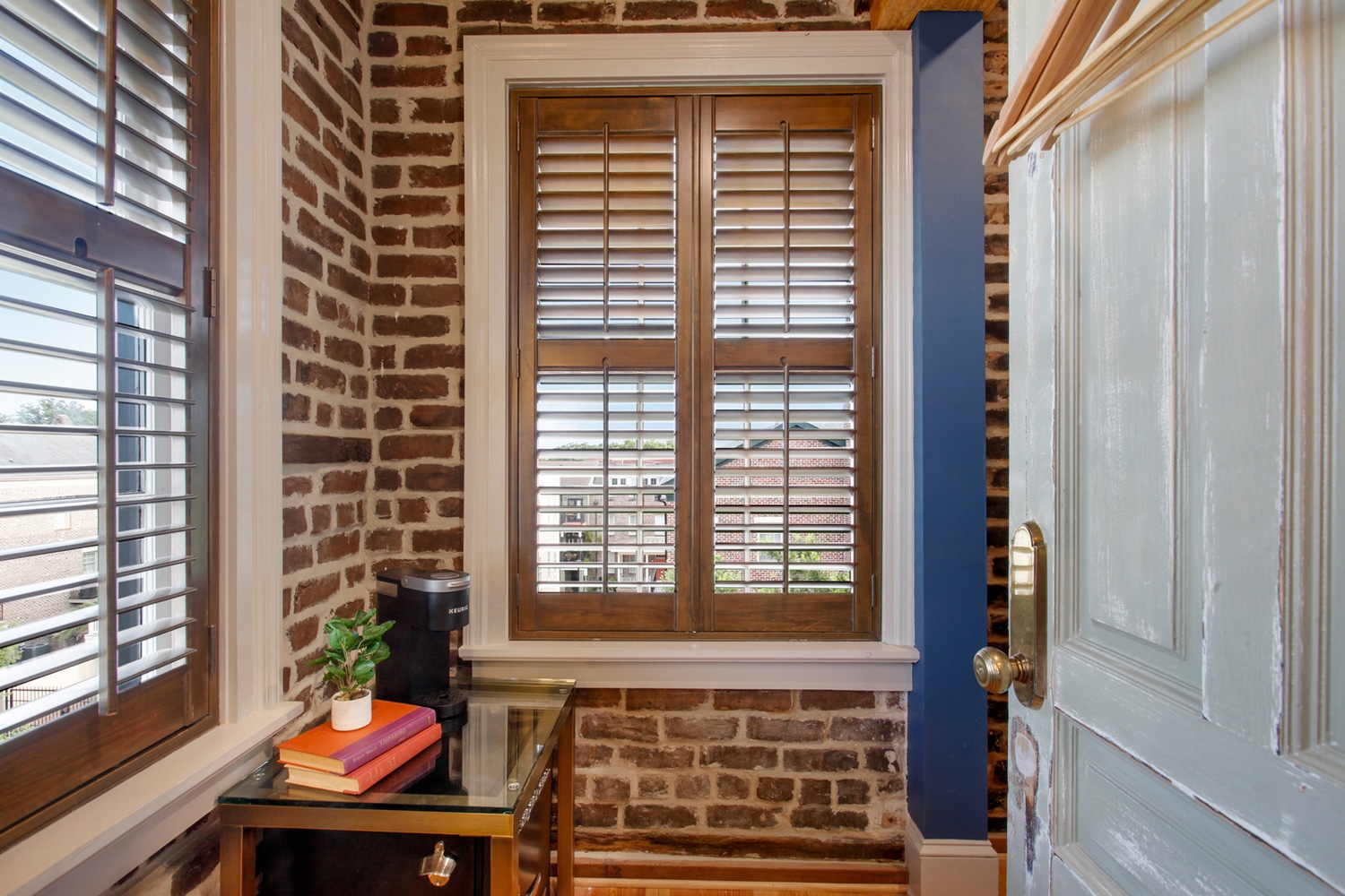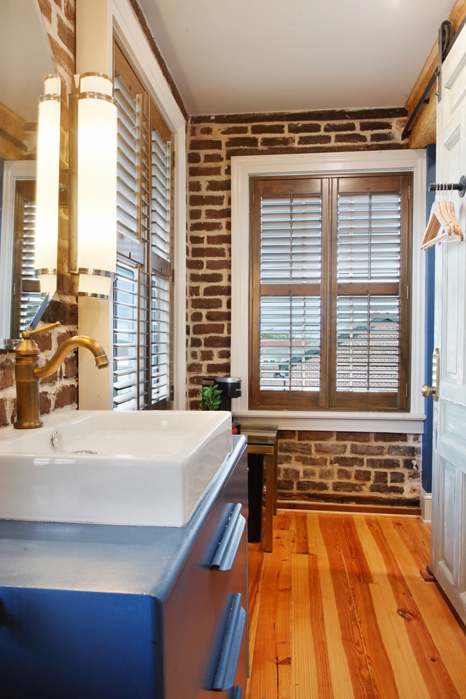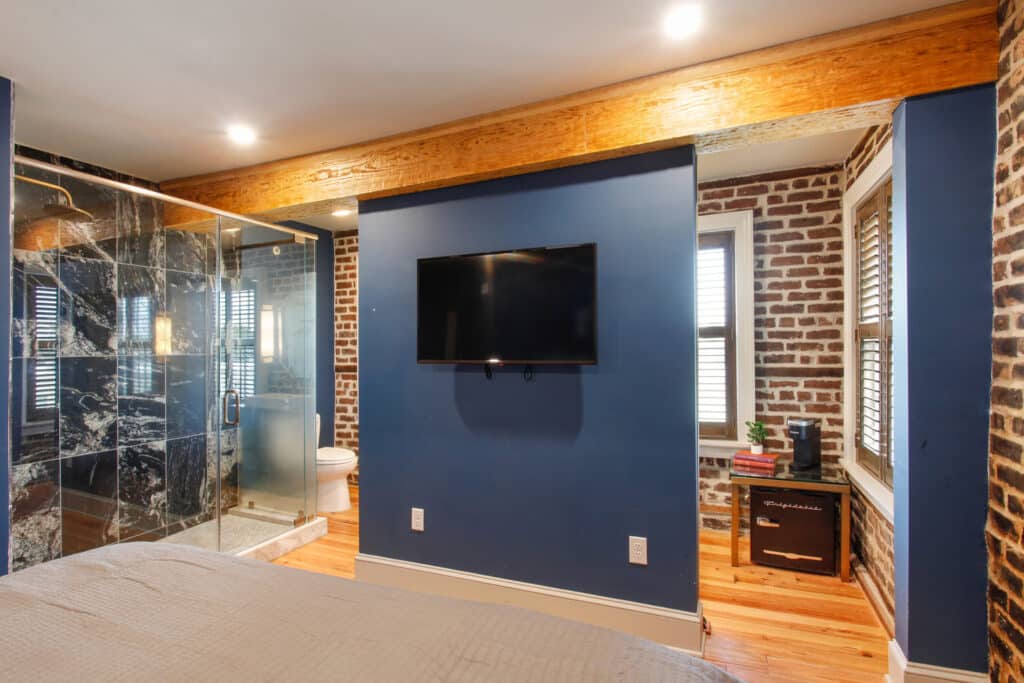 This stunning fourth-floor unit offers the perfect getaway in Downtown Savannah. It features a luxurious King bed, ideal for two guests, and a unique walk-in shower. The shower is partially located within the sleeping area, creating an open, airy feel, while the toilet is in a separate space, though it is visible through the glass of the shower. This distinctive layout adds to the suite’s charm and modern appeal. This is a fourth-floor that is accessible via 3 flights of stairs, as there are no elevators at the property. Room is in the main tower of property is accessible via main entrance off Houston St. or Courtyard off East McDonough St.
